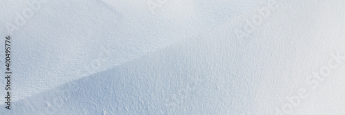 Beautiful winter background with snowy ground. Natural snow texture. Wind sculpted patterns on snow surface. Wide panoramic texture for background and design.