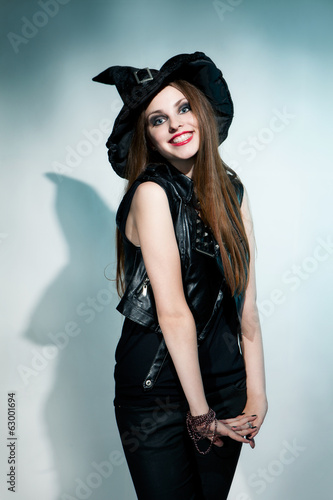 attractive, beautiful, belonging, black, brunette, celebrate, celebration, chain, costume, dark, dream, female, game, girl, give, hair, halloween, hand, hat, hold, holiday, pointing, jacket, laugh, leather, long, magic, magician, make-up, november, race, raise, role, sexy, show, slim, smile, racked, studio, very, white, sorcerer, woman, young