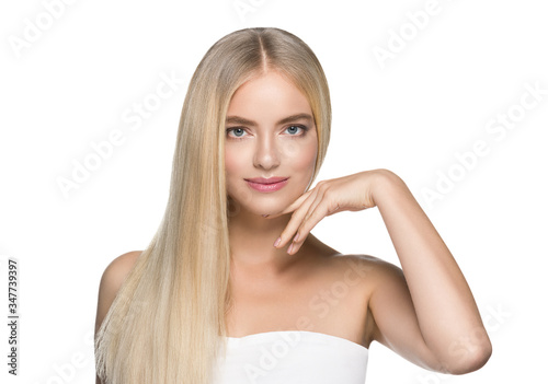 Beautiful woman blonde long smooth hair natural beauty smile happy