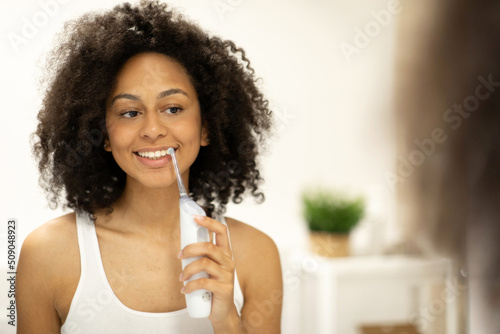 Beautiful woman cleaning teeth with irrigator tool looking into the mirror in the bathroom