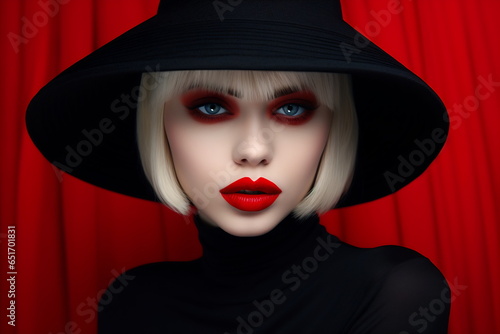 lip, red, black, fashion, hat, make-up, model, elegant, lipstick, portrait, girl, beautiful, female, lady, retro, face, glamour, beauty, young, sexy, stylish, style, woman, woman, attractive, dark, vintage, gorgeous, art, people, elegance, studio, background, adult, cute, wide, rimmed, cosmetic, closeup, make up, sensual, broad, luxury, white, mysterious, romantic, riddle, birthmark, cover