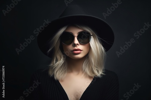 Beautiful woman in black hat and glasses, fashion magazine cover