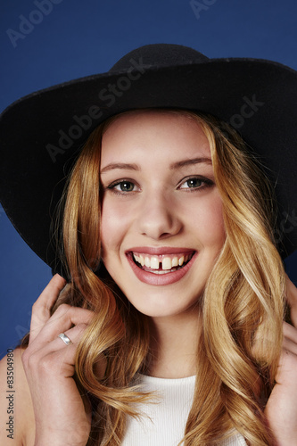 vertical, photo, color image, missy, studio shot, indoor, one person, woman, front view, long hair, blue eye, hat, smiling, caucasian appearance, glamour, portrait, closeup, blue, blue background, beautiful woman, beauty