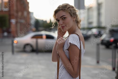 woman, girl, dress, white, city, curly, young, beautiful, fashion, elegant, attractive, female, one person, caucasian, bag