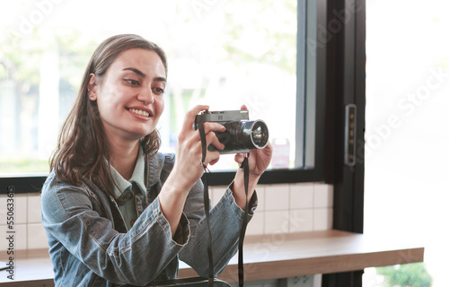 Beautiful woman is a professional photographer with a camera in a cafe using a computer.