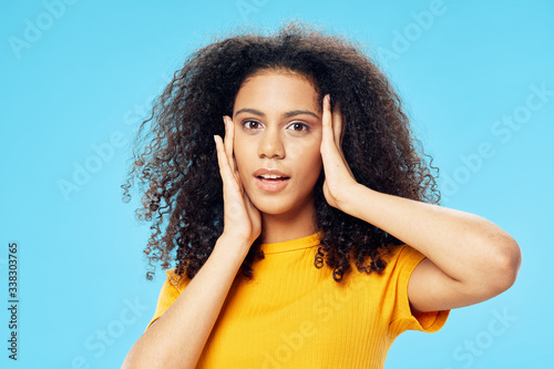 african, american, woman, black, happy, young, girl, female, portrait, face, background, model, adult, studio, afro, people, pretty, person, white, ethnic, fun, beauty, teenage, smile, attractive, sad, laugh, depressed, lifestyle, stress, head, curly, casual attire, hair, student, summer, nice, cephalalgia, excited, health, colours, fashion, coiffure, view, side, stylish, natural, surprise, blue, yellow