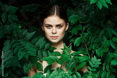 beautiful woman skin care bare shoulders green leaves nature close-up