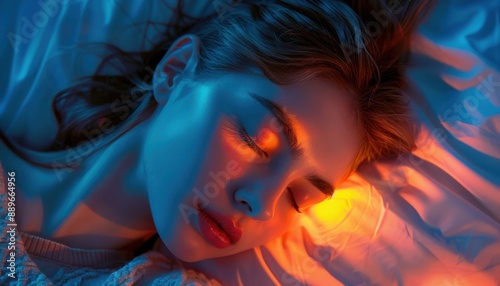 Beautiful woman sleeping in bed, night light on her face, orange and blue colors, neon effect, close-up, beautiful woman with brown hair
