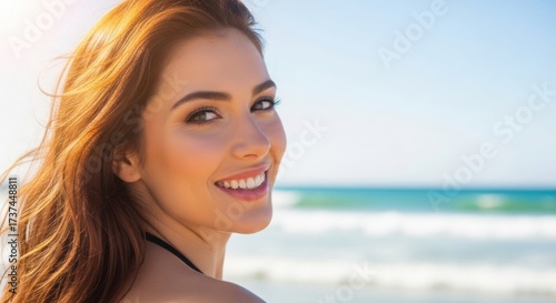 woman, beach, smile, portrait, summer, sea, ocean, vacation, beauty, face, hair, girl, travel, tour tourism, female, model, sunlight, happy, person, nature, camera, sunny, wavy, warm, inviting, expression, visible, background, creating, serene, atmosphere, honed
