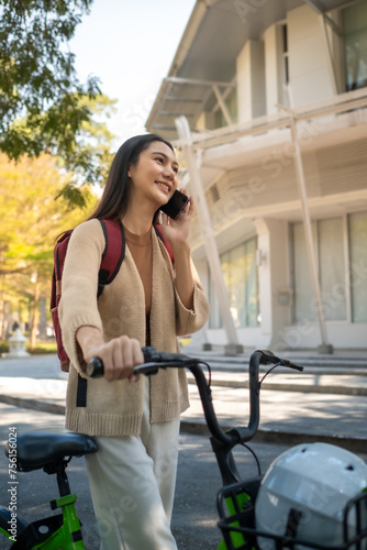 Beautiful woman taking a bike stroll in the park, business woman holding smartphone using bike rental, business woman holding smartphone using bike rental digital phone