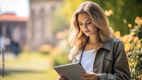 Beautiful woman using a tablet in the park.