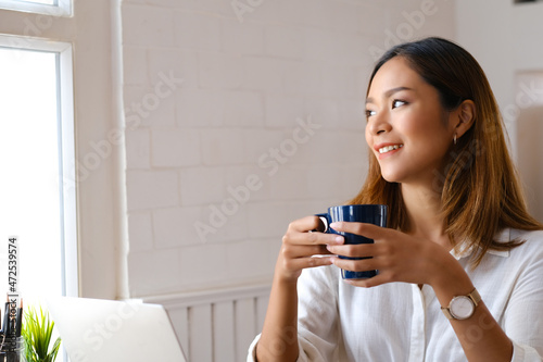 beautiful, business, businesswoman, cafes, hot drink, computer, cup, communication, girl, happy, holding, cyberspace, laptop, people, person, smile, technology, work, room, coffee cup, device, wi-fi, drinking, freelance, drink