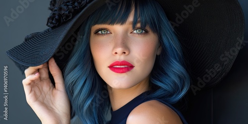 Beautiful woman with blue hair and a hat, wearing red lipstick, against a dark background.
