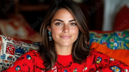 woman, girl, female, model, portrait, face, smiling, happy, beautiful, pretty, attractive, brown hair, long hair, red sweater, knitwear, jumper, earring, jewellery, accessory, fashion, style, beauty, cosmetic, make-up, skincare, expression, emotion, positive, confident, relaxed, casual attire, indoor, home, cosy, comfortable, lifestyle, people, head shot, closeup, young adult