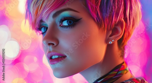 beautiful woman with colorful hair, bright colors, colorful background, hair color is pink orange yellow blue green purple white silver gray, hair length short pixie cut