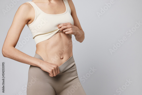 abdomen, abs, active, adult, athletic, background, beautiful, beige, belly, body, care, closeup, copy, diet, female, figure, fit, fitness, flat, girl, goal, grey, gym, hand, health, healthy, lifestyle, loss, model, honed, person, posing, pretty, shape, showing, skin, slim, space, sport, activewear, studio, text, thin, training, treatment, waist, weight, well-being, wellness