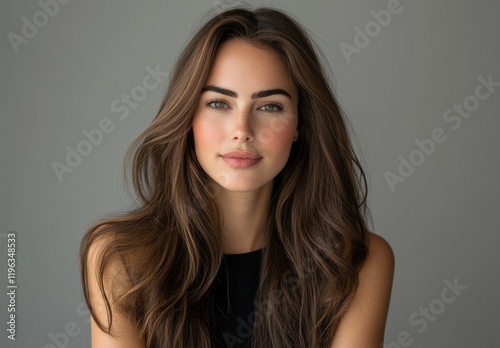 Beautiful woman with long brown hair, perfectly straight and shiny hairstyle