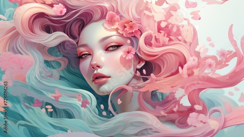 Beautiful woman with long curly pink hair. Perfect makeup. Beauty, fashion