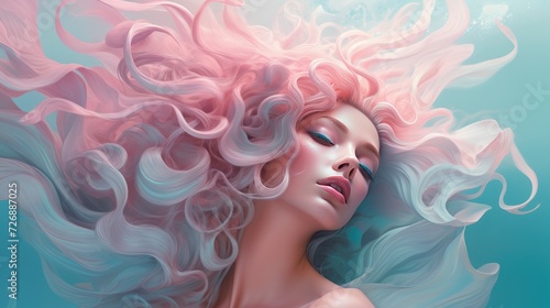 Beautiful woman with long curly pink hair. Perfect makeup. Beauty, fashion