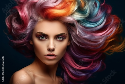 Beautiful woman with multi-coloured hair and creative make up and hairstyle