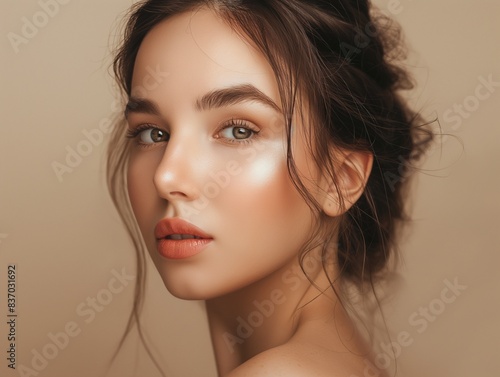 Beautiful Woman with perfect skin Portrait. Brunette Girl, empty copy space