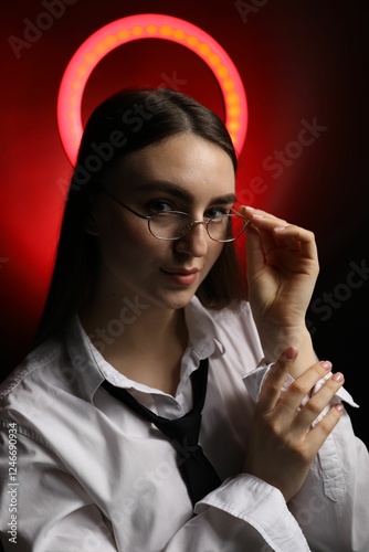 adult, appearance, art, background, beautiful, beauty, caucasian, circle, colours, cool, dark, elegance, equipment, expression, face, fashion, fashionable, female, film, glamour, goggles, illumination, industry, lady, lamp, leisure, lifestyle, light, model, necktie, neon, office, person, portrait, posing, red, ring, round, shooting, studio, style, stylish, trend, trendy, vertical, vogue, wearing, woman