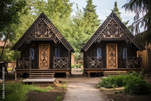 Beautiful wooden chalets in rustic style, tourism and rest concept. Generative AI