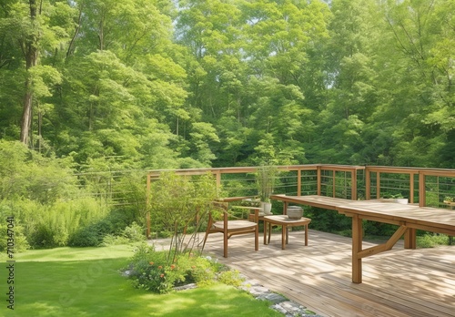 Beautiful wooden terrace with garden furniture surrounded by greenery on a warm, summer day