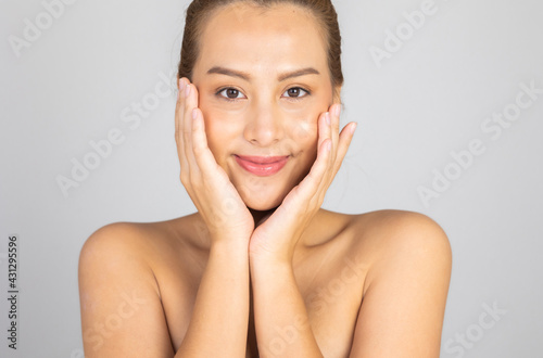 Beautiful Young Asian Woman short hair with Clean Fresh Skin. Face care, Facial treatment, Cosmetology, beauty and healthy skin and cosmetic ideas concept.
