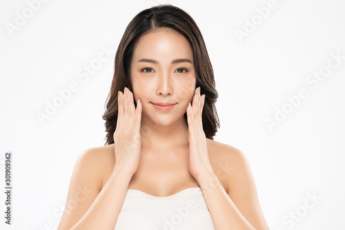 Beautiful young Asian woman touching soft cheek and smile with clean and fresh skin. Happiness and cheerful with, isolated on white background, Beauty and Cosmetics Concept,