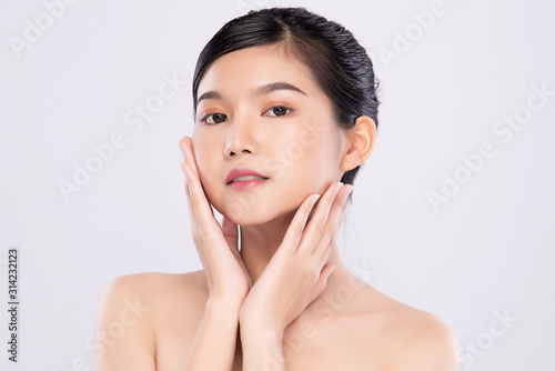 Beautiful Young Asian Woman with Clean Fresh Skin. Face care, Facial treatment, on light grey background, Beauty and Cosmetics Concept