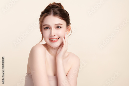 Beautiful young asian woman with clean fresh skin on beige background, Face care, Facial treatment, Cosmetology, beauty and spa, Asian women portrait.