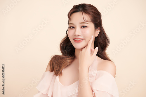 Beautiful young asian woman with clean fresh skin on beige background, Face care, Facial treatment, Cosmetology, beauty and spa, Asian women portrait.