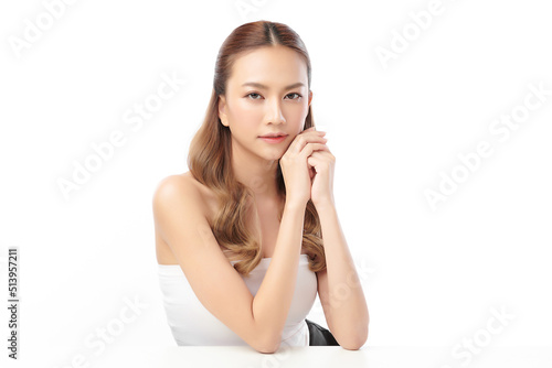 Beautiful young asian woman with clean fresh skin on white background, Face care, Facial treatment, Cosmetology, beauty and spa, Asian women portrait.