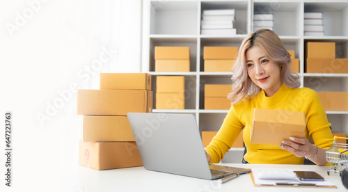 Beautiful young Asian woman working with online sales box with laptop taking online orders at home, SME business concept