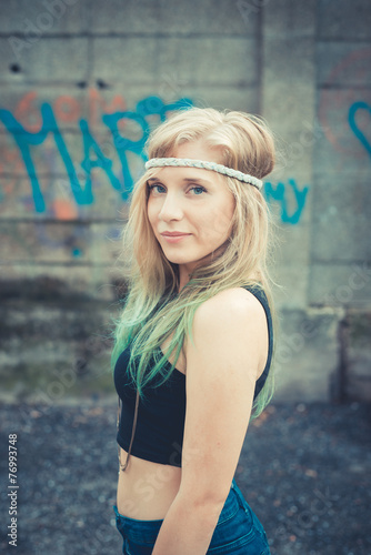 woman, beautiful, rebel, young, hipster, authentic, real, blond, coloured, hair, coiffure, candid, retro, filtered, flower child, unusual, diverse, diversity, caucasian, modern, lifestyle, summer, city, urban, style, rock, alternative, stylish, beauty, attractive, casual attire, cool, fashionable, female, contemporary, trendy, easy, natural, airy