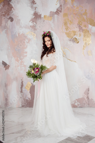 wedding, bride, dress, salon, fashion, beauty, beautiful, girl, woman, bouquet, flower, chaplet, floristry, floral, leaf, spring, style, female, charming, attractive, cute, young, trendy, modern, light, stylish, veil, lace, hide, pastel, background, pink, love, white, elegance, bridal, feminine, person, adult, figure, graceful, caucasian, studio, pretty, luxury, elegant, romantic, glamour, brunette