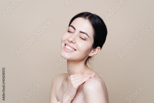 Beautiful young Caucasian woman with clean fresh skin on beige background, Face care, Facial treatment, Cosmetology, beauty and spa, brunette women portrait