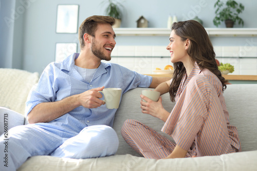 Beautiful young couple in pajamas is looking at each other and smiling on a sofa in the living room.