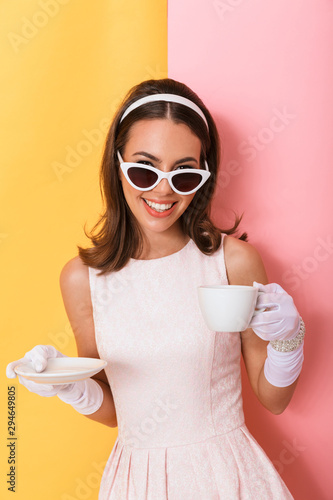 cheerful, woman, smiling, girl, 1, dress, female, happy, looking, young, style, background, beverage, posing, stylish, cup, elegant, portrait, positive, hot drink, person, breakfast, people, isolated, smile, leisure, hand, fun, concept, space, lovely, tea, trendy, pretty, casual attire, lady, joy, beauty, attractive, lifestyle, beautiful, drink, fashion, brunette, caucasian, sunglasses, hairband, royals