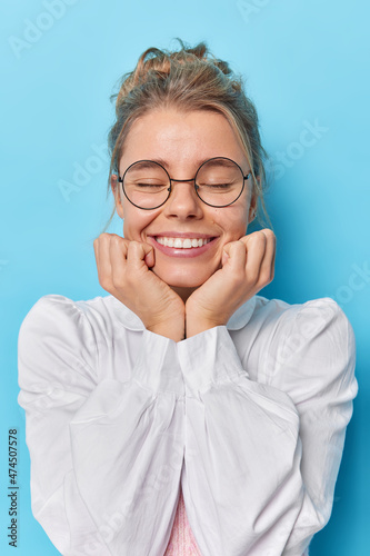 Beautiful young European woman keeps hands under chin smile toothily closes eyes wears round transparent glasses and white elegant shirt isolated over blue background. Happy emotions concept