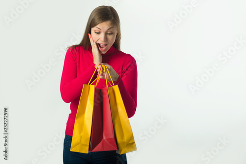 woman, shopping, young, isolated, bag, happy, beautiful, white, fashion, beauty, smile, people, shopper, portrait, lady, cheerful, person, retail, client, dress, happiness, girl, female, cute, caucasian, buying, positive, mood, joy, package, acquisition, attractive, sale, gift, background, sell out, pretty, expression, emotion, lifestyle, holding, purchase, surprise, red