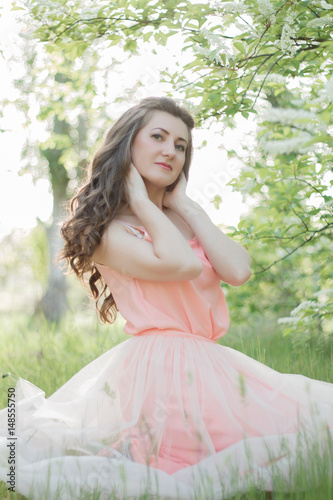 Beautiful young girl in a delicate tulle dress sitting among the flowering spring trees in an outdoor park. Fine art