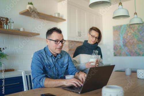 Beautiful young married couple having breakfast together working on laptop at table or reading news. Loving husband and wife making plans for vacation in the kitchen at home