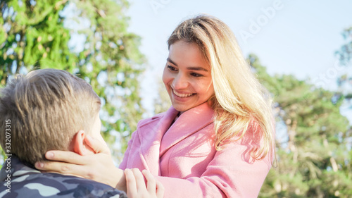 Beautiful young mother and son loving each other. Mom and son in the nature smiling and laughing looking into each others eyes. Sunny day in the nature. Family unity concept.