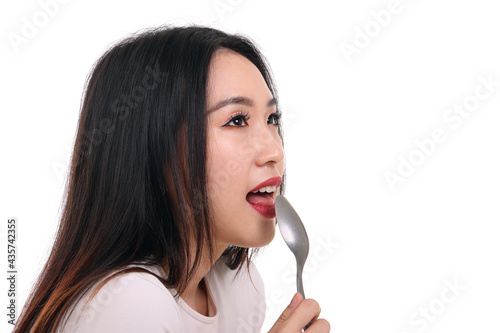 Beautiful young south east Asian woman pretend acting posing holding empty spoon in hand on lips tongue eat taste lick white background imagine yummy