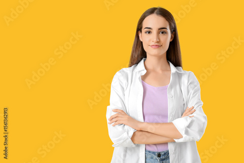 Beautiful young stylish happy woman on yellow background