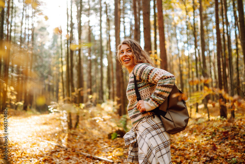 Beautiful young tourist with a backpack is having fun in the autumn forest, throwing fallen leaves. Woman walks along a colorful path in the forest. Freedom, travel.