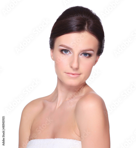 spa, skin, care, face, health, towel, treatment, freshness, smile, portrait, head, relaxation, glamour, young, human, shoulder, happiness, adult, luxury, clean, serene, caucasian, female, woman, therapy, healthy, 20s, body, beauty, femininity, elegance, enjoyment, beautiful, hygiene, purity, brunette, make-up, white, background, isolated