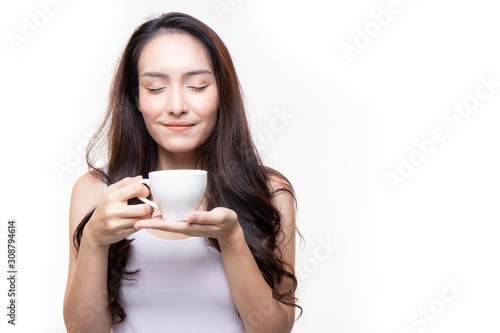 Beautiful young woman drinking coffee in the morning feeling fresh. Charming beautiful young woman hands holding hot cup of coffee or tea standing isolated on white background.